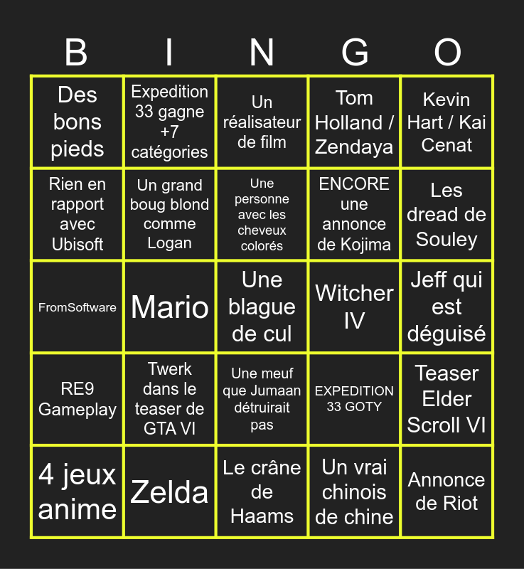 This bingo card has 25 words: Twerk dans le teaser de GTA VI, Le crâne de Haams, Une personne avec les cheveux colorés, 4 jeux anime, Kevin Hart / Kai Cenat, Des bons pieds, Rien en rapport avec Ubisoft, Expedition 33 gagne +7 catégories, Witcher IV, Une meuf que Jumaan détruirait pas, ENCORE une annonce de Kojima, FromSoftware, EXPEDITION 33 GOTY, Teaser Elder Scroll VI, Un grand boug blond comme Logan, Annonce de Riot, Jeff qui est déguisé, Un réalisateur de film, Les dread de Souley, Mario, Une blague de cul, Zelda, RE9 Gameplay, Tom Holland / Zendaya and Un vrai chinois de chine.