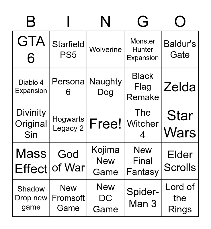 This bingo card has a free space and 24 words: God of War, New Fromsoft Game, Naughty Dog, Shadow Drop new game, Baldur's Gate, GTA 6, Diablo 4 Expansion, Starfield PS5, The Witcher 4, Kojima New Game, Black Flag Remake, Divinity Original Sin, New Final Fantasy, Elder Scrolls, Persona 6, Spider-Man 3, Star Wars, Wolverine, Zelda, Hogwarts Legacy 2, Lord of the Rings, Mass Effect, Monster Hunter Expansion and New DC Game.