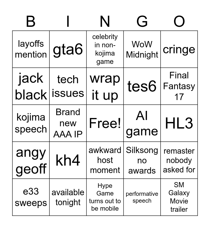 This bingo card has a free space and 24 words: kh4, available tonight, wrap it up, e33 sweeps, cringe, layoffs mention, jack black, gta6, AI game, awkward host moment, tes6, kojima speech, Silksong no awards, remaster nobody asked for, tech issues, performative speech, HL3, celebrity in non-kojima game, Final Fantasy 17, Brand new AAA IP, SM Galaxy Movie trailer, angy geoff, WoW Midnight and Hype Game turns out to be mobile.