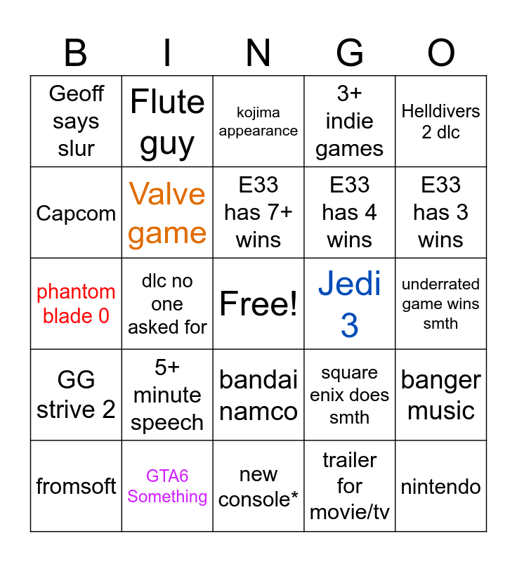 This bingo card has a free space and 24 words: 5+ minute speech, GTA6 Something, E33 has 7+ wins, fromsoft, Helldivers 2 dlc, Geoff says slur, Capcom, Flute guy, Jedi 3, bandai namco, E33 has 4 wins, phantom blade 0, square enix does smth, banger music, Valve game, trailer for movie/tv, underrated game wins smth, kojima appearance, E33 has 3 wins, dlc no one asked for, nintendo, GG strive 2, 3+ indie games and new console*.