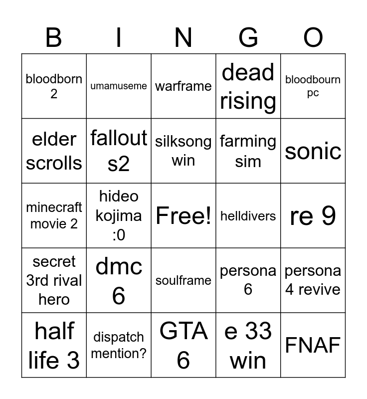 This bingo card has a free space and 24 words: half life 3, dmc 6, silksong win, e 33 win, bloodbourn pc, bloodborn 2, umamuseme, warframe, helldivers, re 9, minecraft movie 2, fallout s2, persona 6, persona 4 revive, elder scrolls, dispatch mention?, GTA 6, dead rising, sonic, secret 3rd rival hero, hideo kojima :0, soulframe, farming sim and FNAF.