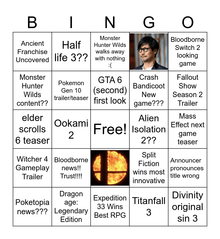 This bingo card has 2 images, a free space and 22 words: Bloodborne news!! Trust!!!!, Dragon age: Legendary Edition, GTA 6 (second) first look, Poketopia news???, Bloodborne Switch 2 looking game, Ancient Franchise Uncovered, Monster Hunter Wilds content??, Half life 3??, Alien Isolation 2??, Crash Bandicoot New game???, elder scrolls 6 teaser, Split Fiction wins most innovative, Announcer pronounces title wrong, Pokemon Gen 10 trailer/teaser, Titanfall 3, Mass Effect next game teaser, Monster Hunter Wilds walks away with nothing :(, Fallout Show Season 2 Trailer, Ookami 2, Divinity original sin 3, Witcher 4 Gameplay Trailer and Expedition 33 Wins Best RPG.