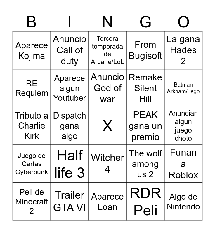 This bingo card has a free space and 24 words: Half life 3, Trailer GTA VI, Anuncio God of war, Peli de Minecraft 2, La gana Hades 2, Aparece Kojima, RE Requiem, Anuncio Call of duty, PEAK gana un premio, Witcher 4, Remake Silent Hill, Tributo a Charlie Kirk, The wolf among us 2, Funan a Roblox, Aparece algun Youtuber, RDR Peli, Anuncian algun juego choto, Tercera temporada de Arcane/LoL, Batman Arkham/Lego, Dispatch gana algo, Algo de Nintendo, Juego de Cartas Cyberpunk, From Bugisoft and Aparece Loan.