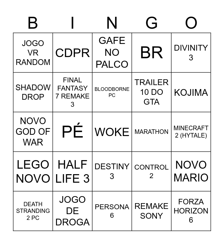 This bingo card has 25 words: HALF LIFE 3, PERSONA 6, BLOODBORNE PC, DEATH STRANDING 2 PC, DIVINITY 3, JOGO VR RANDOM, SHADOW DROP, CDPR, MARATHON, DESTINY 3, TRAILER 10 DO GTA, NOVO GOD OF WAR, CONTROL 2, NOVO MARIO, FINAL FANTASY 7 REMAKE 3, FORZA HORIZON 6, MINECRAFT 2 (HYTALE), GAFE NO PALCO, KOJIMA, PÉ, WOKE, JOGO DE DROGA, LEGO NOVO, BR and REMAKE SONY.