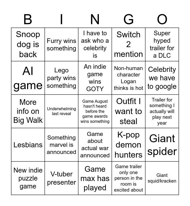 This bingo card has a free space and 24 words: New indie puzzle game, Something marvel is announced, An indie game wins GOTY, Game trailer only one person in the room is excited about, Super hyped trailer for a DLC, Snoop dog is back, Furry wins something, I have to ask who a celebrity is, Outfit I want to steal, Trailer for something I actually will play next year, More info on Big Walk, Lego party wins something, K-pop demon hunters, Giant spider, AI game, V-tuber presenter, Game max has played, Switch 2 mention, Celebrity we have to google, Lesbians, Underwhelming last reveal, Game about actual war announced, Non-human character Logan thinks is hot and Giant squid/kracken.