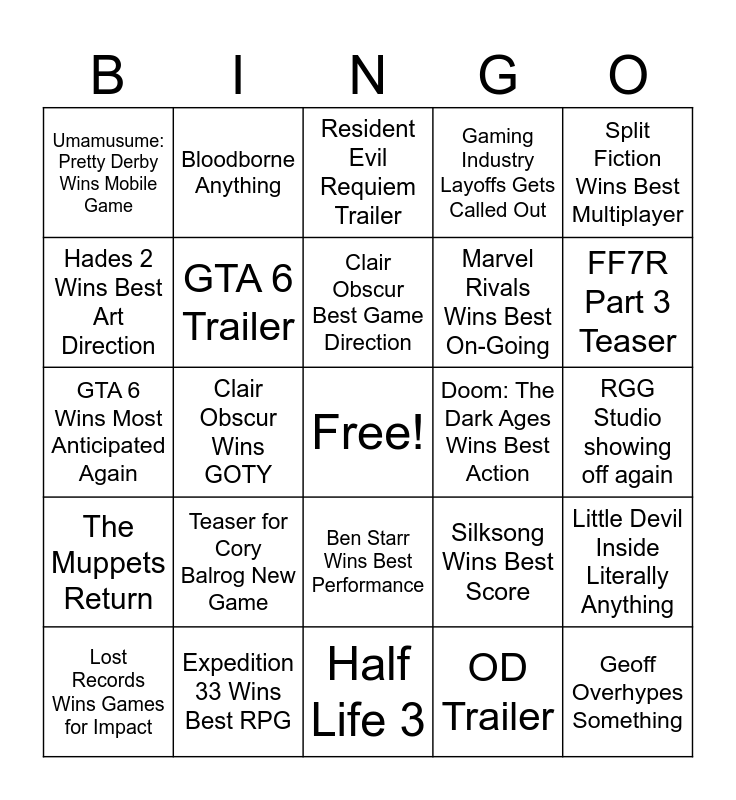 This bingo card has a free space and 24 words: Teaser for Cory Balrog New Game, Expedition 33 Wins Best RPG, Clair Obscur Best Game Direction, Lost Records Wins Games for Impact, Split Fiction Wins Best Multiplayer, Umamusume: Pretty Derby Wins Mobile Game, Hades 2 Wins Best Art Direction, Bloodborne Anything, Doom: The Dark Ages Wins Best Action, Ben Starr Wins Best Performance, Marvel Rivals Wins Best On-Going, GTA 6 Wins Most Anticipated Again, Silksong Wins Best Score, Little Devil Inside Literally Anything, GTA 6 Trailer, OD Trailer, RGG Studio showing off again, Resident Evil Requiem Trailer, FF7R Part 3 Teaser, Clair Obscur Wins GOTY, Geoff Overhypes Something, The Muppets Return, Gaming Industry Layoffs Gets Called Out and Half Life 3.
