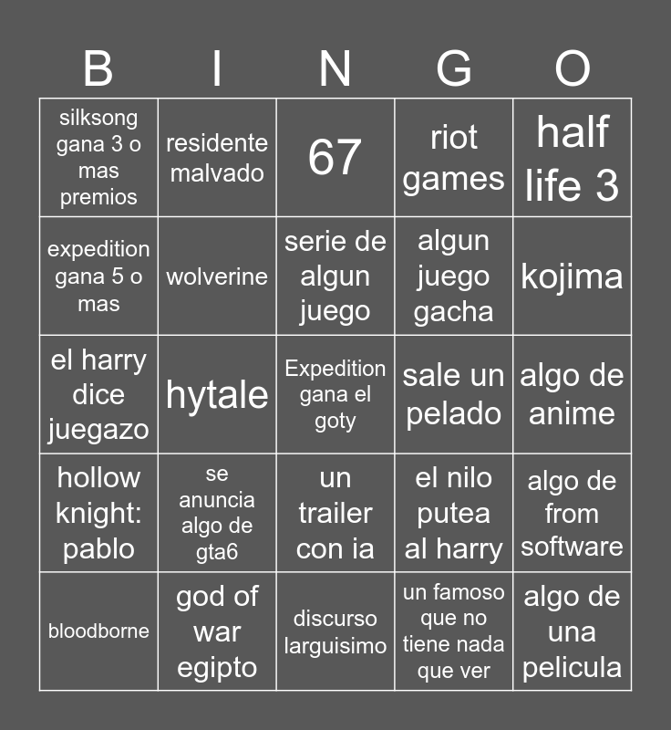 This bingo card has a free space and 24 words: se anuncia algo de gta6, god of war egipto, serie de algun juego, bloodborne, half life 3, silksong gana 3 o mas premios, expedition gana 5 o mas, residente malvado, sale un pelado, un trailer con ia, algun juego gacha, el harry dice juegazo, el nilo putea al harry, algo de from software, wolverine, un famoso que no tiene nada que ver, algo de anime, 67, kojima, hytale, algo de una pelicula, hollow knight: pablo, riot games and discurso larguisimo.