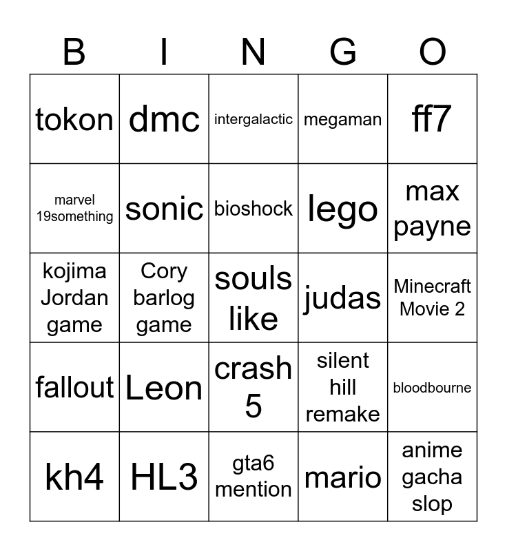 This bingo card has a free space and 24 words: Leon, HL3, bioshock, kh4, ff7, tokon, marvel 19something, dmc, judas, crash 5, lego, kojima Jordan game, silent hill remake, bloodbourne, sonic, mario, Minecraft Movie 2, intergalactic, max payne, Cory barlog game, anime gacha slop, fallout, megaman and gta6 mention.