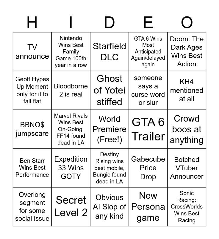 This bingo card has a free space and 39 words: Half-Life 3 Announced, Security Violation, DS2 WIN, awkward hug between geoff/hideo, Bloodborne 2 is real, Overlong segment for some social issue, Destiny Rising wins best mobile, Bungie found dead in LA, Ghost of Yotei stiffed, Elder Scrolls VI (Todd lies), Doom: The Dark Ages Wins Best Action, Ben Starr Wins Best Performance, Marvel Rivals Wins Best On-Going, FF14 found dead in LA, GTA 6 Wins Most Anticipated Again/delayed again, Sonic Racing: CrossWorlds Wins Best Racing, Crowd boos at anything, GTA 6 Trailer, Expedition 33 Wins GOTY, Ubisoft direct, new IP announced (wins no award), TV announce, FF7R Part 3 Teaser, Gabecube Price Drop, Geoff Hypes Up Moment only for it to fall flat, Obvious AI Slop of any kind, someone says a curse word or slur, KH4 mentioned at all, Capcom does something with another old IP, Medabots Survivors trailer, NO Man's Sky wins ongoing, Smash bros. announce, Sleep Token Surprise Performance, Nintendo Wins Best Family Game 100th year in a row, 343 fumbles something, TV announce, Starfield DLC, Secret Level 2, New Persona game, Divinity 3, Botched VTuber Announcer, BBNO$ jumpscare and Flute Guy.
