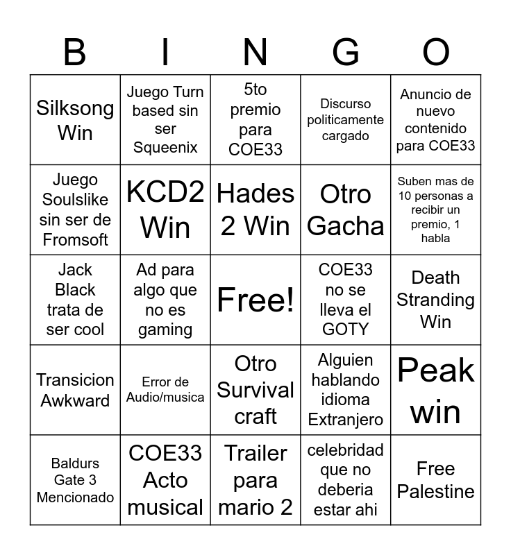 This bingo card has a free space and 29 words: Discurso incomodo, COE33 Acto musical, 5to premio para COE33, Musica interrumpe Discurso, Anuncio de nuevo contenido para COE33, Silksong Win, KCD2 Win, Hades 2 Win, COE33 no se lleva el GOTY, Peak win, Baldurs Gate 3 Mencionado, Ad para algo que no es gaming, celebridad que no deberia estar ahi, Free Palestine, Jack Black trata de ser cool, Trailer Para Zelda, Trailer para mario 2, Alguien hablando idioma Extranjero, Suben mas de 10 personas a recibir un premio, 1 habla, Transicion Awkward, Error de Audio/musica, Nuevo Juego Friend Slop, Otro Gacha, Death Stranding Win, Juego Soulslike sin ser de Fromsoft, Juego Turn based sin ser Squeenix, Otro Survival craft, Discurso politicamente cargado and Baguette cosplay.
