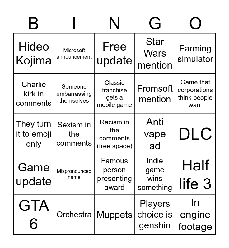 This bingo card has a free space and 29 words: GTA 6, Nintendo appearance, Sexism in the comments, Sappy trailer, Hideo Kojima, Free update, Someone embarrassing themselves, Mispronounced name, Anti vape ad, Orchestra, DLC, In engine footage, Muppets, Players choice is genshin, Game that corporations think people want, Someone larping as a video game character donating, Famous person presenting award, Game update, Farming simulator, They turn it to emoji only, Indie game wins something, Cool game gets announced, Fromsoft mention, Charlie kirk in comments, Star Wars mention, Microsoft announcement, Half life 3, Classic franchise gets a mobile game and Mobile game slop.