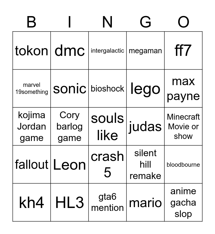 This bingo card has a free space and 24 words: Leon, HL3, bioshock, kh4, ff7, tokon, marvel 19something, dmc, judas, crash 5, lego, kojima Jordan game, silent hill remake, bloodbourne, sonic, mario, Minecraft Movie or show, intergalactic, max payne, Cory barlog game, anime gacha slop, fallout, megaman and gta6 mention.