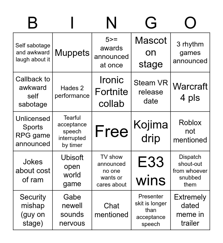 This bingo card has a free space and 24 words: Ubisoft open world game, Gabe newell sounds nervous, Ironic Fortnite collab, Security mishap (guy on stage), 3 rhythm games announced, Self sabotage and awkward laugh about it, Callback to awkward self sabotage, Muppets, Kojima drip, TV show announced no one wants or cares about, Steam VR release date, Unlicensed Sports RPG game announced, E33 wins, Dispatch shout-out from whoever snubbed them, Hades 2 performance, Presenter skit is longer than acceptance speech, Roblox not mentioned, 5>= awards announced at once, Warcraft 4 pls, Tearful acceptance speech interrupted by timer, Extremely dated meme in trailer, Jokes about cost of ram, Mascot on stage and Chat mentioned.