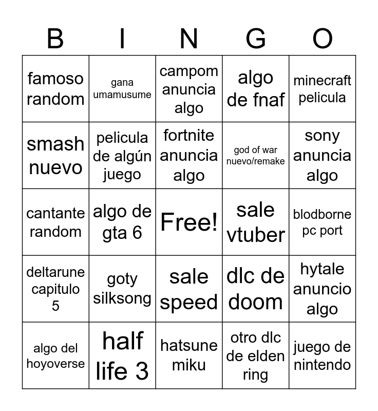 This bingo card has a free space and 24 words: goty silksong, half life 3, fortnite anuncia algo, algo del hoyoverse, minecraft pelicula, famoso random, smash nuevo, gana umamusume, sale vtuber, sale speed, god of war nuevo/remake, cantante random, dlc de doom, hytale anuncio algo, pelicula de algún juego, otro dlc de elden ring, blodborne pc port, campom anuncia algo, sony anuncia algo, algo de gta 6, juego de nintendo, deltarune capitulo 5, algo de fnaf and hatsune miku.