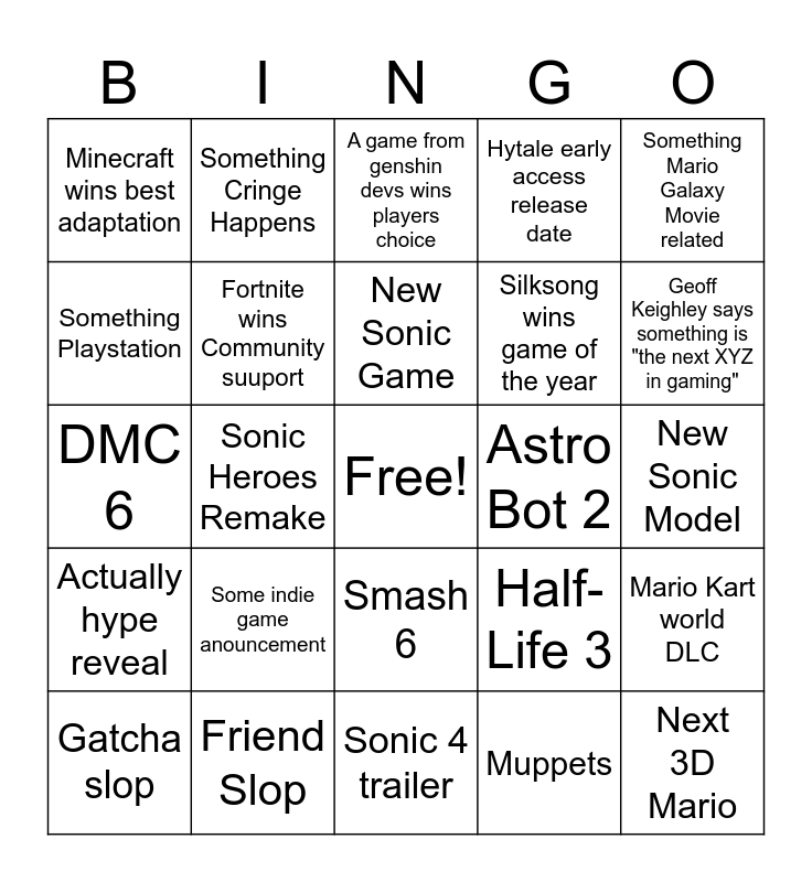 This bingo card has a free space and 24 words: Some indie game anouncement, Friend Slop, New Sonic Game, Gatcha slop, Something Mario Galaxy Movie related, Minecraft wins best adaptation, Something Playstation, Something Cringe Happens, Astro Bot 2, Smash 6, Silksong wins game of the year, DMC 6, Half-Life 3, Mario Kart world DLC, Fortnite wins Community suuport, Muppets, New Sonic Model, A game from genshin devs wins players choice, Geoff Keighley says something is "the next XYZ in gaming", Sonic Heroes Remake, Next 3D Mario, Actually hype reveal, Hytale early access release date and Sonic 4 trailer.