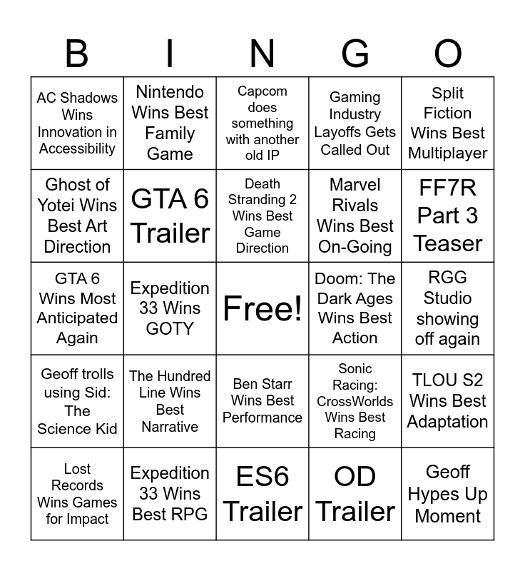 This bingo card has a free space and 24 words: The Hundred Line Wins Best Narrative, Expedition 33 Wins Best RPG, Death Stranding 2 Wins Best Game Direction, Lost Records Wins Games for Impact, Split Fiction Wins Best Multiplayer, AC Shadows Wins Innovation in Accessibility, Ghost of Yotei Wins Best Art Direction, Nintendo Wins Best Family Game, Doom: The Dark Ages Wins Best Action, Ben Starr Wins Best Performance, Marvel Rivals Wins Best On-Going, GTA 6 Wins Most Anticipated Again, Sonic Racing: CrossWorlds Wins Best Racing, TLOU S2 Wins Best Adaptation, GTA 6 Trailer, OD Trailer, RGG Studio showing off again, Capcom does something with another old IP, FF7R Part 3 Teaser, Expedition 33 Wins GOTY, Geoff Hypes Up Moment, Geoff trolls using Sid: The Science Kid, Gaming Industry Layoffs Gets Called Out and ES6 Trailer.