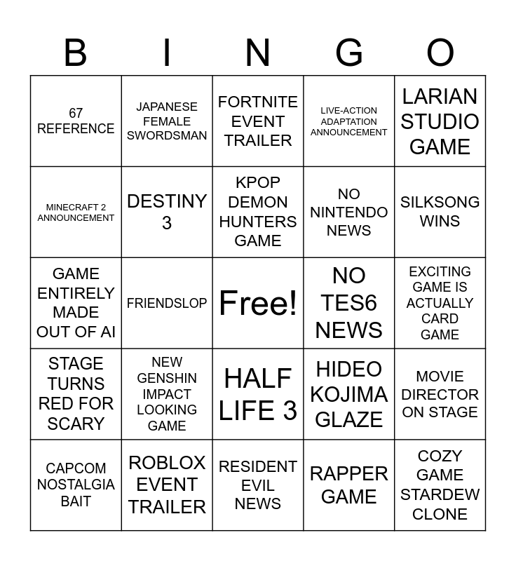 This bingo card has a free space and 24 words: NEW GENSHIN IMPACT LOOKING GAME, ROBLOX EVENT TRAILER, KPOP DEMON HUNTERS GAME, CAPCOM NOSTALGIA BAIT, LARIAN STUDIO GAME, 67 REFERENCE, MINECRAFT 2 ANNOUNCEMENT, JAPANESE FEMALE SWORDSMAN, NO TES6 NEWS, HALF LIFE 3, NO NINTENDO NEWS, GAME ENTIRELY MADE OUT OF AI, HIDEO KOJIMA GLAZE, MOVIE DIRECTOR ON STAGE, DESTINY 3, RAPPER GAME, EXCITING GAME IS ACTUALLY CARD GAME, FORTNITE EVENT TRAILER, SILKSONG WINS, FRIENDSLOP, COZY GAME STARDEW CLONE, STAGE TURNS RED FOR SCARY, LIVE-ACTION ADAPTATION ANNOUNCEMENT and RESIDENT EVIL NEWS.