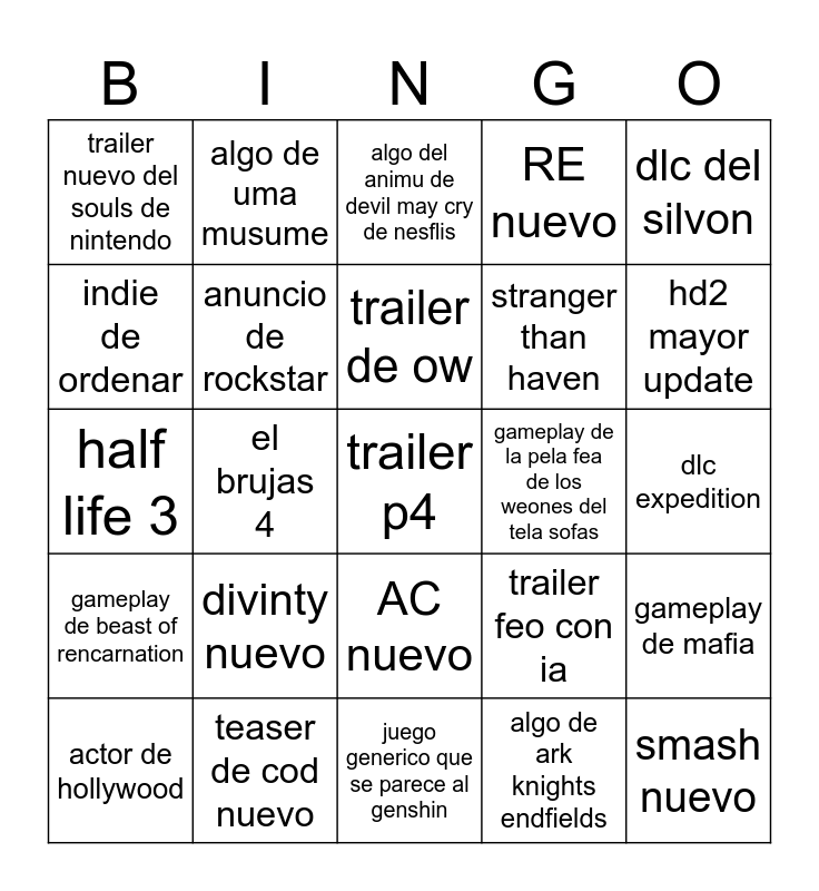 This bingo card has a free space and 39 words: elder scrolls 6, farcry, remaster bully, anuncio de rockstar, actor de hollywood, AC nuevo, trailer de ow, spore remake, dlc del silvon, gameplay de beast of rencarnation, el brujas 4, RE nuevo, smash nuevo, dlc expedition, gameplay de la pela fea de los weones del tela sofas, divinty nuevo, algo del hoyoverso, trailer nuevo del souls de nintendo, trailer o teaser de la serie de wh40k, trailer feo con ia, indie de ordenar, juego generico que se parece al genshin, stranger than haven, hd2 mayor update, juego de pelea de anime generico, algo de yoko taro, algo de fallout, algo de hytale, algo de gta 6, algo de uma musume, remaster de god of war, dlc metaphor, algo del animu de devil may cry de nesflis, teaser de cod nuevo, algo de ark knights endfields, algo de metro, gameplay de mafia, half life 3 and algo de ashes of creations.