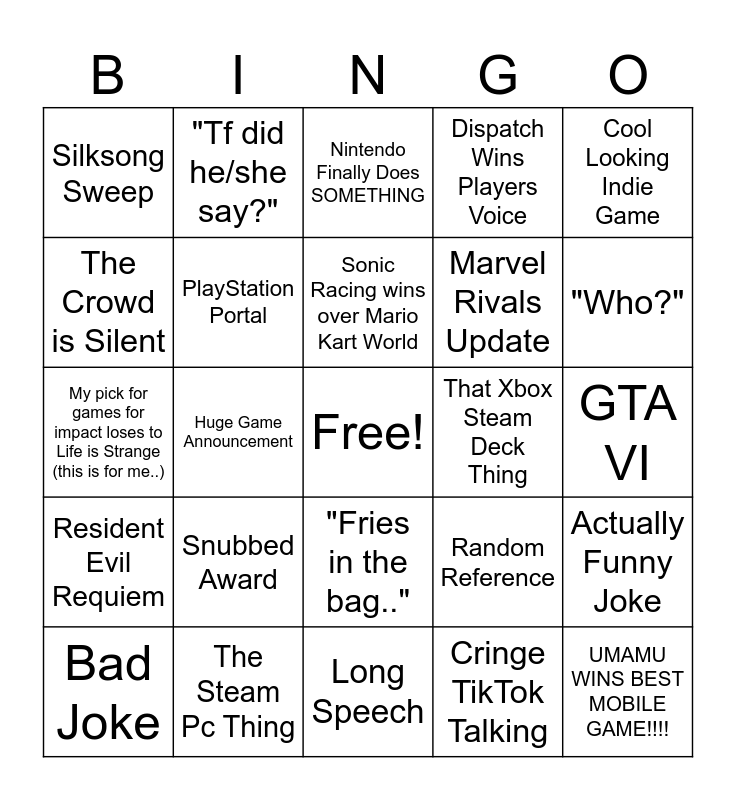 This bingo card has a free space and 29 words: Bad Joke, Random Ai Slop (not ever forgetting that cat game from last year), Huge Game Announcement, "Who asked for this?", Silksong Sweep, Nintendo Finally Does SOMETHING, PlayStation Portal, Snubbed Award, That Xbox Steam Deck Thing, The Steam Pc Thing, GTA VI, UMAMU WINS BEST MOBILE GAME!!!!, Long Speech, Cringe TikTok Talking, "Who?", Geoff Talks At All, "Fries in the bag..", Resident Evil Requiem, Cool Looking Indie Game, My pick for games for impact loses to Life is Strange (this is for me..), Random Reference, Random Game Update, Marvel Rivals Update, The Crowd is Silent, Dispatch Wins Players Voice, "Tf did he/she say?", Actually Funny Joke, Sonic Racing wins over Mario Kart World and Expedition 33 Sweep.