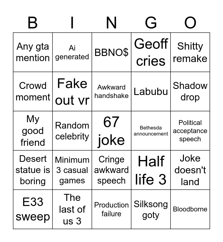 This bingo card has a free space and 24 words: Minimum 3 casual games, The last of us 3, Awkward handshake, E33 sweep, Shitty remake, Any gta mention, Crowd moment, Ai generated, Bethesda announcement, Cringe awkward speech, Labubu, My good friend, Half life 3, Joke doesn't land, Fake out vr, Silksong goty, Political acceptance speech, BBNO$, Shadow drop, Random celebrity, Bloodborne, Desert statue is boring, Geoff cries and Production failure.