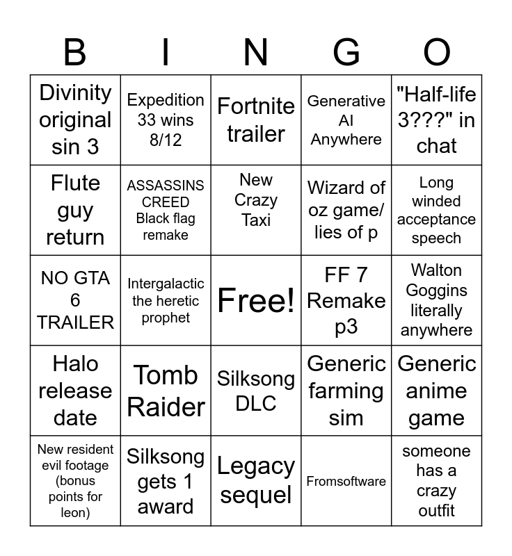 This bingo card has a free space and 24 words: New resident evil footage (bonus points for leon), Tomb Raider, New Crazy Taxi, Fromsoftware, "Half-life 3???" in chat, Divinity original sin 3, Expedition 33 wins 8/12, Fortnite trailer, FF 7 Remake p3, Walton Goggins literally anywhere, NO GTA 6 TRAILER, ASSASSINS CREED Black flag remake, Generic farming sim, Generic anime game, Flute guy return, Silksong gets 1 award, Legacy sequel, Generative AI Anywhere, Long winded acceptance speech, Halo release date, Intergalactic the heretic prophet, Silksong DLC, Wizard of oz game/ lies of p and someone has a crazy outfit.