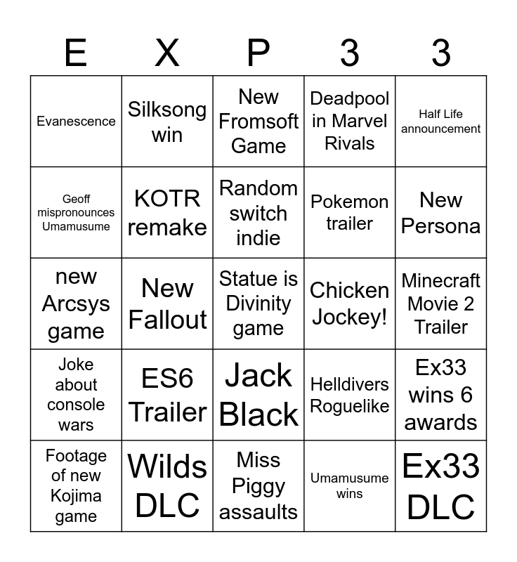 This bingo card has a free space and 24 words: ES6 Trailer, Wilds DLC, Random switch indie, Footage of new Kojima game, Half Life announcement, Evanescence, Geoff mispronounces Umamusume, Silksong win, Chicken Jockey!, Jack Black, Pokemon trailer, new Arcsys game, Helldivers Roguelike, Ex33 wins 6 awards, KOTR remake, Umamusume wins, Minecraft Movie 2 Trailer, New Fromsoft Game, New Persona, New Fallout, Ex33 DLC, Joke about console wars, Deadpool in Marvel Rivals and Miss Piggy assaults.