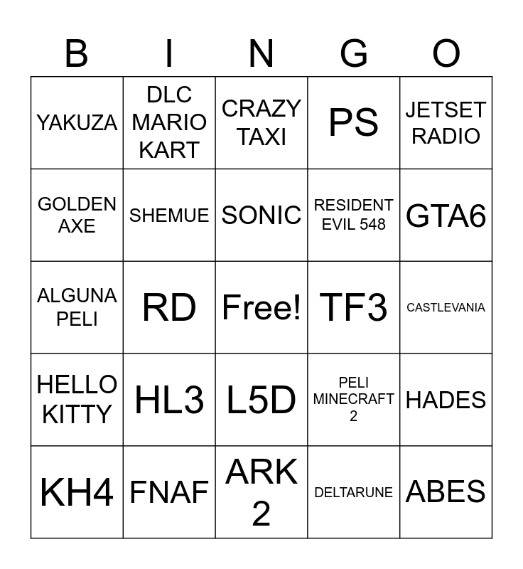 This bingo card has a free space and 24 words: HL3, FNAF, SONIC, KH4, JETSET RADIO, YAKUZA, GOLDEN AXE, DLC MARIO KART, TF3, L5D, RESIDENT EVIL 548, ALGUNA PELI, PELI MINECRAFT 2, HADES, SHEMUE, DELTARUNE, CASTLEVANIA, CRAZY TAXI, GTA6, RD, ABES, HELLO KITTY, PS and ARK 2.