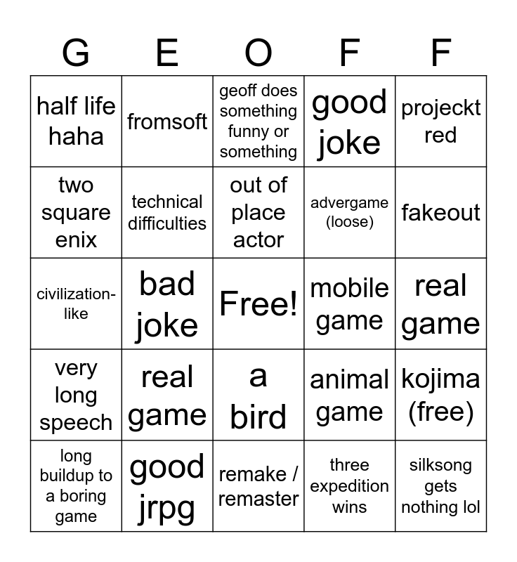 This bingo card has a free space and 24 words: real game, good jrpg, out of place actor, long buildup to a boring game, projeckt red, half life haha, two square enix, fromsoft, mobile game, a bird, advergame (loose), civilization-like, animal game, kojima (free), technical difficulties, three expedition wins, real game, geoff does something funny or something, fakeout, bad joke, silksong gets nothing lol, very long speech, good joke and remake / remaster.