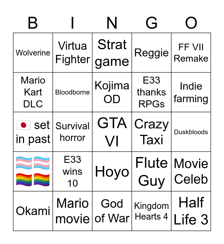 This bingo card has 25 words: E33 wins 10, God of War, Kojima OD, Okami, FF VII Remake, Wolverine, Mario Kart DLC, Virtua Fighter, Crazy Taxi, Hoyo, E33 thanks RPGs, 🇯🇵 set in past, Flute Guy, Movie Celeb, Bloodborne, Half Life 3, Duskbloods, Strat game, Indie farming, Survival horror, GTA VI, Mario movie, 🏳️⚧️🏳️⚧️🏳️🌈🏳️🌈, Reggie and Kingdom Hearts 4.