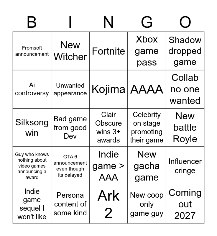 This bingo card has a free space and 24 words: GTA 6 announcement even though its delayed, Persona content of some kind, Kojima, Indie game sequel I won't like, Shadow dropped game, Fromsoft announcement, Ai controversy, New Witcher, Celebrity on stage promoting their game, Indie game > AAA, AAAA, Silksong win, New gacha game, Influencer cringe, Unwanted appearance, New coop only game guy, New battle Royle, Fortnite, Collab no one wanted, Bad game from good Dev, Coming out 2027, Guy who knows nothing about video games announcing a award, Xbox game pass and Ark 2.