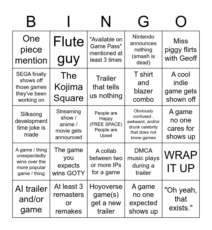 This bingo card has a free space and 24 words: The game you expects wins GOTY, At least 3 remasters or remakes, Trailer that tells us nothing, AI trailer and/or game, Miss piggy flirts with Geoff, One piece mention, SEGA finally shows off those games they've been working on, Flute guy, Obviously confused , awkward, and/or drunk celebrity that does not know games, A collab between two or more IPs for a game, T shirt and blazer combo, Silksong development time joke is made, DMCA music plays during a trailer, WRAP IT UP, The Kojima Square, A game no one expected shows up, A game no one cares for shows up, "Available on Game Pass" mentioned at least 3 times, A cool indie game gets shown off, Streaming show / anime / movie gets announced, "Oh yeah, that exists.", A game / thing unexpectedly wins over the more popular game / thing, Nintendo announces nothing (smash is dead) and Hoyoverse game(s) get a new trailer.
