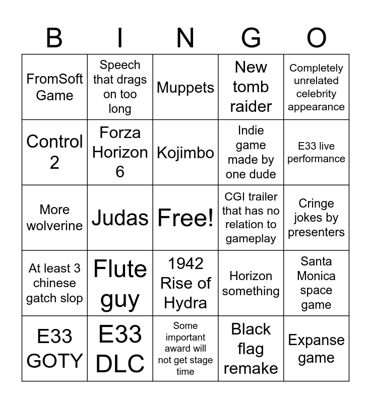 This bingo card has a free space and 24 words: Flute guy, E33 DLC, Kojimbo, E33 GOTY, Completely unrelated celebrity appearance, FromSoft Game, Control 2, Speech that drags on too long, CGI trailer that has no relation to gameplay, 1942 Rise of Hydra, Indie game made by one dude, More wolverine, Horizon something, Santa Monica space game, Forza Horizon 6, Black flag remake, Cringe jokes by presenters, Muppets, E33 live performance, Judas, Expanse game, At least 3 chinese gatch slop, New tomb raider and Some important award will not get stage time.