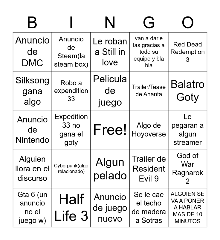 This bingo card has a free space and 24 words: Cyberpunk(algo relacionado), Half Life 3, Pelicula de juego, Gta 6 (un anuncio no el juego w), Red Dead Redemption 3, Anuncio de DMC, Silksong gana algo, Anuncio de Steam(la steam box), Algo de Hoyoverse, Algun pelado, Trailer/Tease de Ananta, Anuncio de Nintendo, Trailer de Resident Evil 9, God of War Ragnarok 2, Robo a expendition 33, Se le cae el techo de madera a Sotras, Le pegaran a algun streamer, Le roban a Still in love, Balatro Goty, Expedition 33 no gana el goty, ALGUIEN SE VA A PONER A HABLAR MAS DE 10 MINUTOS, Alguien llora en el discurso, van a darle las gracias a todo su equipo y bla bla and Anuncio de juego nuevo.