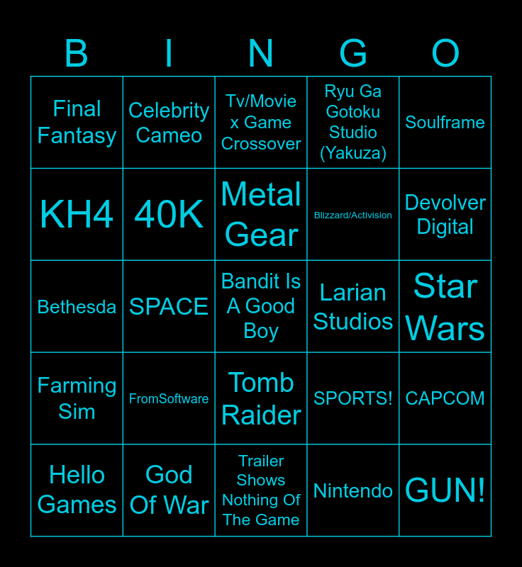 This bingo card has a free space and 24 words: FromSoftware, God Of War, Metal Gear, Hello Games, Soulframe, Final Fantasy, KH4, Celebrity Cameo, Larian Studios, Tomb Raider, Blizzard/Activision, Bethesda, SPORTS!, CAPCOM, 40K, Nintendo, Star Wars, Tv/Movie x Game Crossover, Devolver Digital, SPACE, GUN!, Farming Sim, Ryu Ga Gotoku Studio (Yakuza) and Trailer Shows Nothing Of The Game.