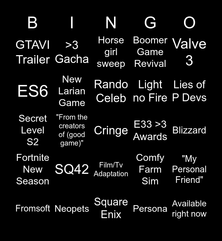This bingo card has a free space and 24 words: SQ42, Neopets, Rando Celeb, Fromsoft, Valve 3, GTAVI Trailer, ES6, >3 Gacha, E33 >3 Awards, Film/Tv Adaptation, Light no Fire, Secret Level S2, Comfy Farm Sim, "My Personal Friend", New Larian Game, Persona, Blizzard, Horse girl sweep, Lies of P Devs, "From the creators of (good game)", Available right now, Fortnite New Season, Boomer Game Revival and Square Enix.