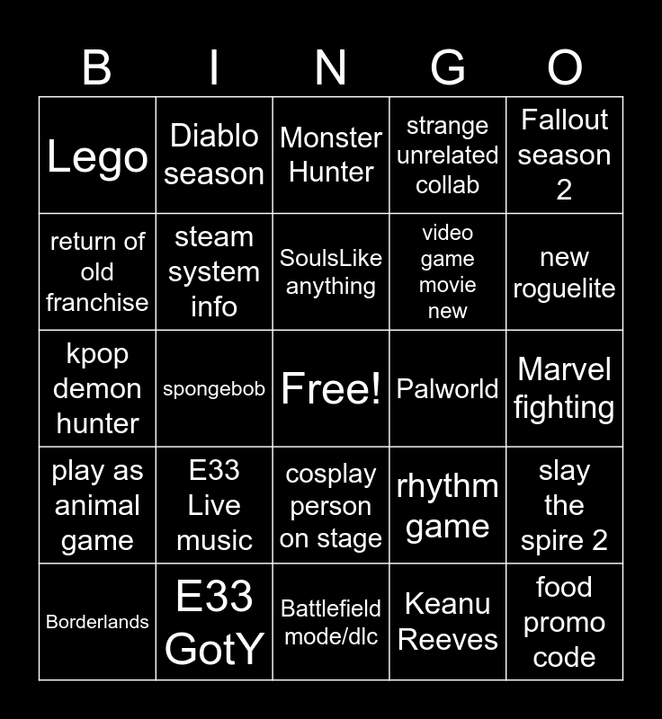 This bingo card has a free space and 24 words: Borderlands, E33 Live music, SoulsLike anything, Keanu Reeves, Fallout season 2, Lego, Diablo season, Monster Hunter, Palworld, Marvel fighting, kpop demon hunter, steam system info, rhythm game, slay the spire 2, return of old franchise, E33 GotY, Battlefield mode/dlc, strange unrelated collab, new roguelite, play as animal game, spongebob, cosplay person on stage, video game movie new and food promo code.