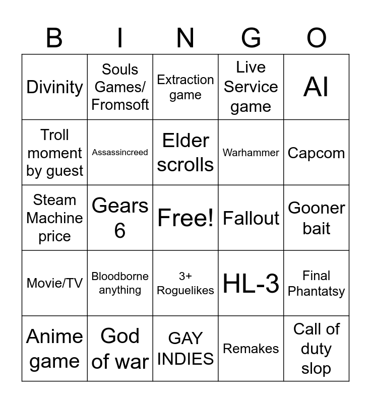 This bingo card has a free space and 24 words: Bloodborne anything, God of war, Elder scrolls, Anime game, AI, Divinity, Troll moment by guest, Souls Games/ Fromsoft, Fallout, 3+ Roguelikes, Warhammer, Steam Machine price, HL-3, Final Phantatsy, Assassincreed, Remakes, Gooner bait, Extraction game, Capcom, Gears 6, Call of duty slop, Movie/TV, Live Service game and GAY INDIES.