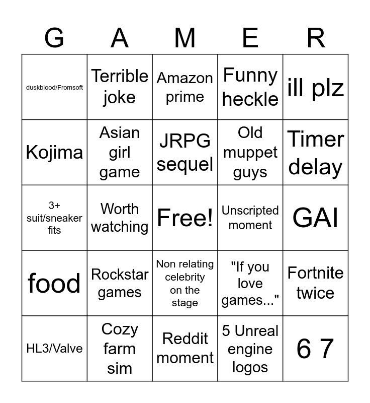 This bingo card has a free space and 24 words: Rockstar games, Cozy farm sim, JRPG sequel, HL3/Valve, ill plz, duskblood/Fromsoft, Kojima, Terrible joke, Unscripted moment, Non relating celebrity on the stage, Old muppet guys, 3+ suit/sneaker fits, "If you love games...", Fortnite twice, Asian girl game, 5 Unreal engine logos, GAI, Amazon prime, Timer delay, Worth watching, 6 7, food, Funny heckle and Reddit moment.