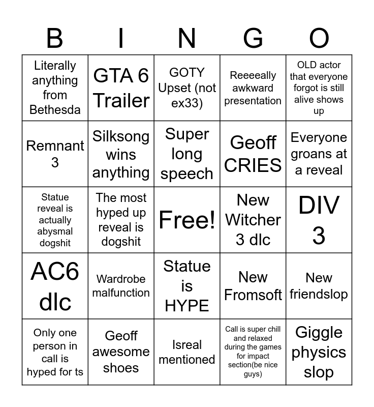 This bingo card has a free space and 24 words: Wardrobe malfunction, Geoff awesome shoes, Super long speech, Only one person in call is hyped for ts, OLD actor that everyone forgot is still alive shows up, Literally anything from Bethesda, Remnant 3, GTA 6 Trailer, New Witcher 3 dlc, Statue is HYPE, Geoff CRIES, Statue reveal is actually abysmal dogshit, New Fromsoft, New friendslop, Silksong wins anything, Call is super chill and relaxed during the games for impact section(be nice guys), DIV 3, GOTY Upset (not ex33), Everyone groans at a reveal, The most hyped up reveal is dogshit, Giggle physics slop, AC6 dlc, Reeeeally awkward presentation and Isreal mentioned.