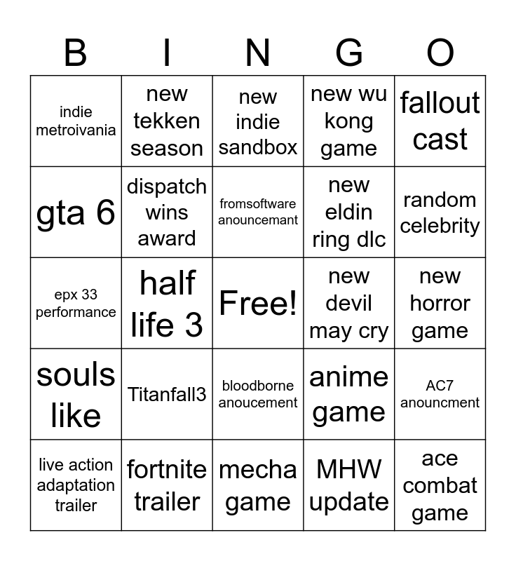 This bingo card has a free space and 24 words: Titanfall3, fortnite trailer, fromsoftware anouncemant, live action adaptation trailer, fallout cast, indie metroivania, gta 6, new tekken season, new devil may cry, bloodborne anoucement, new eldin ring dlc, epx 33 performance, anime game, AC7 anouncment, dispatch wins award, MHW update, new horror game, new indie sandbox, random celebrity, half life 3, ace combat game, souls like, new wu kong game and mecha game.
