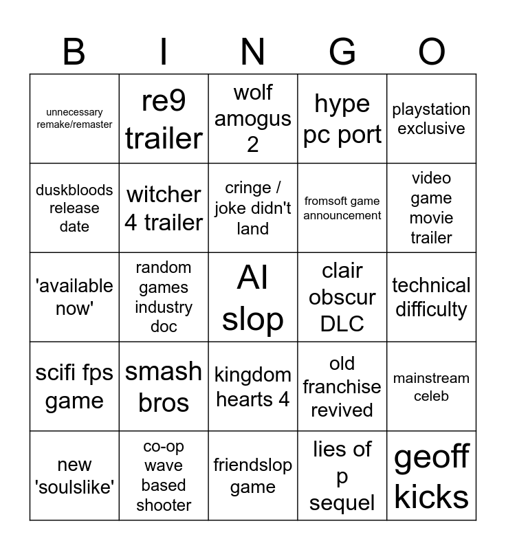 This bingo card has 28 words: mainstream celeb, speech cut off, fromsoft game announcement, lies of p sequel, duskbloods release date, wolf amogus 2, re9 trailer, scifi fps game, clair obscur DLC, new 'soulslike', 'available now', hype pc port, co-op wave based shooter, friendslop game, video game movie trailer, silksong dlc, smash bros, witcher 4 trailer, cringe / joke didn't land, kingdom hearts 4, unnecessary remake/remaster, geoff kicks, AI slop, random games industry doc, technical difficulty, old franchise revived, playstation exclusive and kojima appearance.