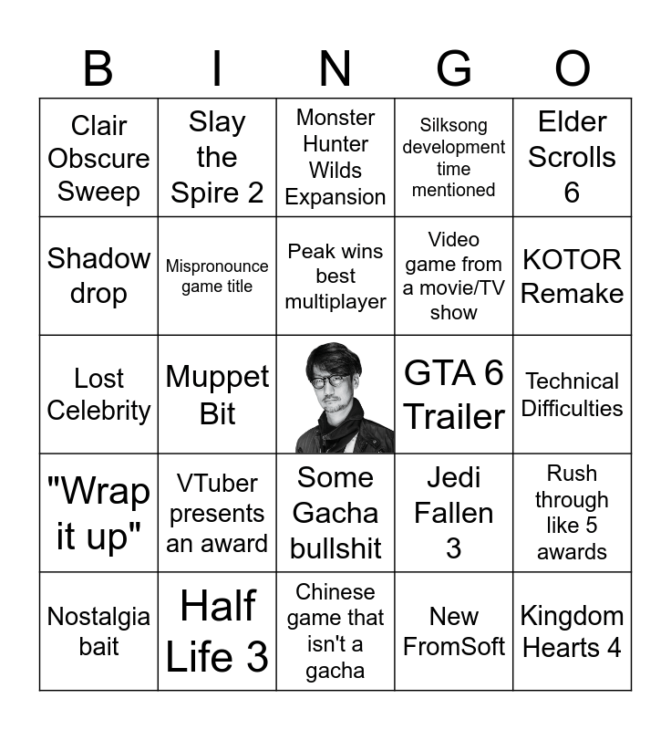 This bingo card has a free space and 24 words: VTuber presents an award, Half Life 3, Peak wins best multiplayer, Nostalgia bait, Elder Scrolls 6, Clair Obscure Sweep, Shadow drop, Slay the Spire 2, GTA 6 Trailer, Some Gacha bullshit, Video game from a movie/TV show, Lost Celebrity, Jedi Fallen 3, Rush through like 5 awards, Mispronounce game title, New FromSoft, Technical Difficulties, Monster Hunter Wilds Expansion, KOTOR Remake, Muppet Bit, Kingdom Hearts 4, "Wrap it up", Silksong development time mentioned and Chinese game that isn't a gacha.