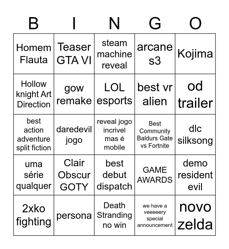 This bingo card has 25 words: Clair Obscur GOTY, Death Stranding no win, LOL esports, 2xko fighting, Kojima, Homem Flauta, Hollow knight Art Direction, Teaser GTA VI, Best Community Baldurs Gate vs Fortnite, best debut dispatch, best vr alien, best action adventure split fiction, GAME AWARDS, demo resident evil, gow remake, novo zelda, dlc silksong, steam machine reveal, od trailer, daredevil jogo, reveal jogo incrivel mas é mobile, persona, uma série qualquer, arcane s3 and we have a veeeeery special announcement.