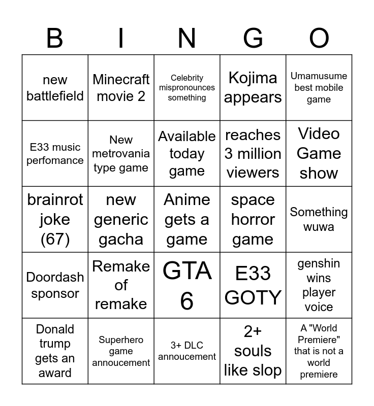 This bingo card has 25 words: Remake of remake, 3+ DLC annoucement, Available today game, Donald trump gets an award, Umamusume best mobile game, new battlefield, E33 music perfomance, Minecraft movie 2, space horror game, GTA 6, reaches 3 million viewers, brainrot joke (67), E33 GOTY, genshin wins player voice, New metrovania type game, A "World Premiere" that is not a world premiere, Something wuwa, Celebrity mispronounces something, Video Game show, new generic gacha, Anime gets a game, Superhero game annoucement, Doordash sponsor, Kojima appears and 2+ souls like slop.