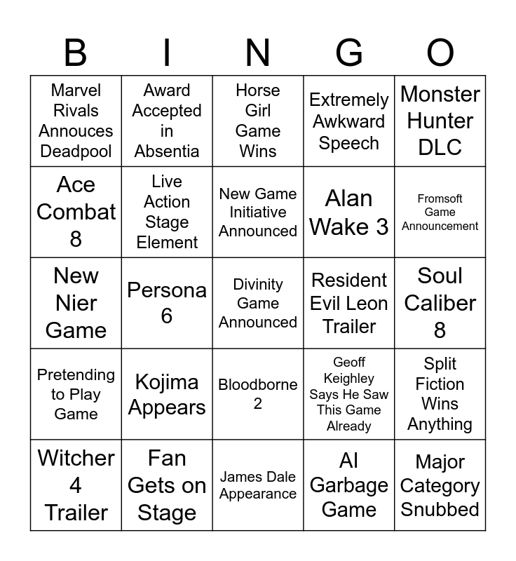 This bingo card has a free space and 24 words: Kojima Appears, Fan Gets on Stage, New Game Initiative Announced, Witcher 4 Trailer, Monster Hunter DLC, Marvel Rivals Annouces Deadpool, Ace Combat 8, Award Accepted in Absentia, Resident Evil Leon Trailer, Bloodborne 2, Alan Wake 3, New Nier Game, Geoff Keighley Says He Saw This Game Already, Split Fiction Wins Anything, Live Action Stage Element, AI Garbage Game, Soul Caliber 8, Horse Girl Game Wins, Fromsoft Game Announcement, Persona 6, Major Category Snubbed, Pretending to Play Game, Extremely Awkward Speech and James Dale Appearance.
