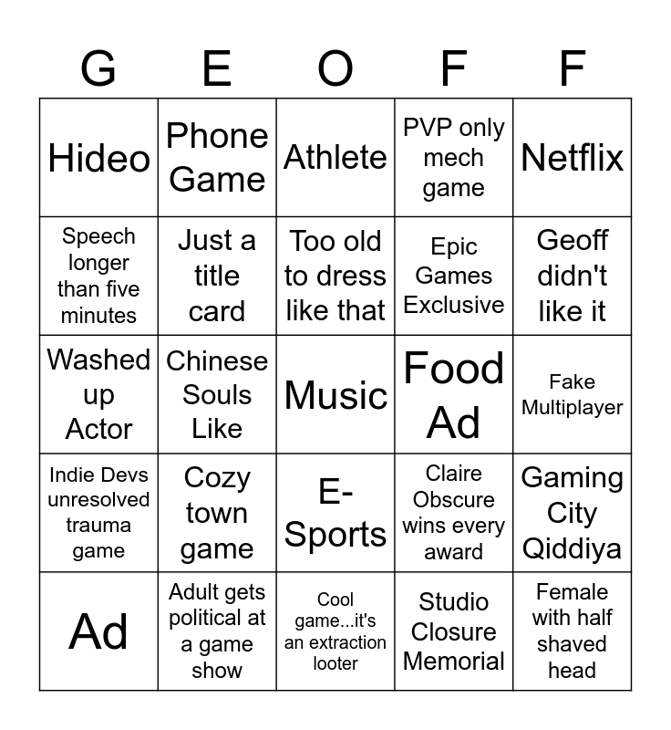 This bingo card has a free space and 24 words: Cozy town game, Adult gets political at a game show, Too old to dress like that, Ad, Netflix, Hideo, Speech longer than five minutes, Phone Game, Food Ad, E-Sports, Epic Games Exclusive, Washed up Actor, Claire Obscure wins every award, Gaming City Qiddiya, Just a title card, Studio Closure Memorial, Fake Multiplayer, Athlete, Geoff didn't like it, Chinese Souls Like, Female with half shaved head, Indie Devs unresolved trauma game, PVP only mech game and Cool game...it's an extraction looter.