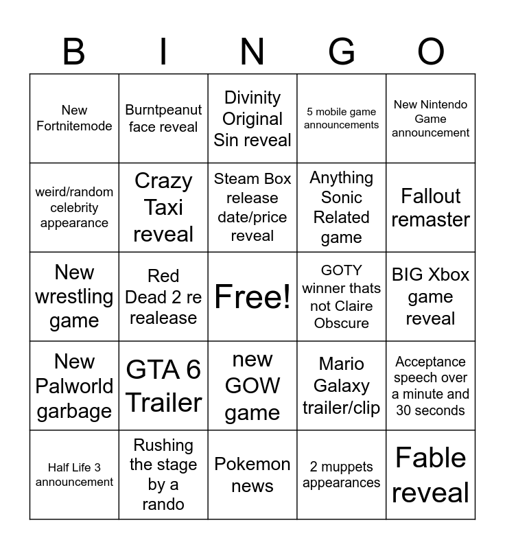 This bingo card has a free space and 24 words: GTA 6 Trailer, Rushing the stage by a rando, Steam Box release date/price reveal, Half Life 3 announcement, New Nintendo Game announcement, New Fortnitemode, weird/random celebrity appearance, Burntpeanut face reveal, GOTY winner thats not Claire Obscure, new GOW game, Anything Sonic Related game, New wrestling game, Mario Galaxy trailer/clip, Acceptance speech over a minute and 30 seconds, Crazy Taxi reveal, 2 muppets appearances, BIG Xbox game reveal, Divinity Original Sin reveal, Fallout remaster, Red Dead 2 re realease, Fable reveal, New Palworld garbage, 5 mobile game announcements and Pokemon news.
