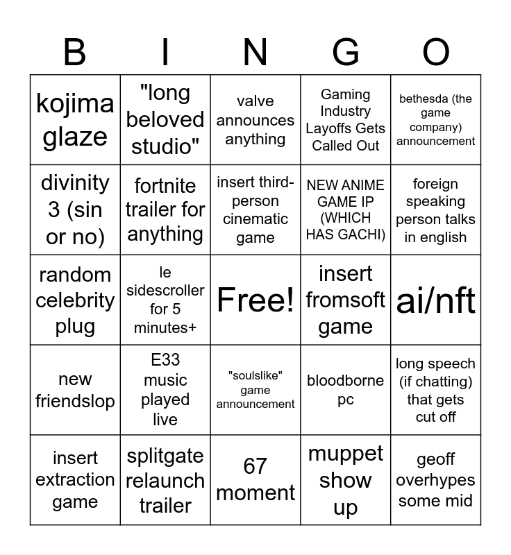 This bingo card has a free space and 24 words: E33 music played live, splitgate relaunch trailer, insert third-person cinematic game, insert extraction game, bethesda (the game company) announcement, kojima glaze, divinity 3 (sin or no), "long beloved studio", insert fromsoft game, "soulslike" game announcement, NEW ANIME GAME IP (WHICH HAS GACHI), random celebrity plug, bloodborne pc, long speech (if chatting) that gets cut off, fortnite trailer for anything, muppet show up, ai/nft, valve announces anything, foreign speaking person talks in english, le sidescroller for 5 minutes+, geoff overhypes some mid, new friendslop, Gaming Industry Layoffs Gets Called Out and 67 moment.