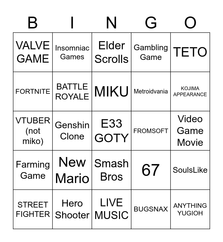 This bingo card has a free space and 24 words: New Mario, Hero Shooter, MIKU, STREET FIGHTER, TETO, VALVE GAME, FORTNITE, Insomniac Games, FROMSOFT, Smash Bros, Metroidvania, VTUBER (not miko), 67, SoulsLike, BATTLE ROYALE, BUGSNAX, Video Game Movie, Elder Scrolls, KOJIMA APPEARANCE, Genshin Clone, ANYTHING YUGIOH, Farming Game, Gambling Game and LIVE MUSIC.