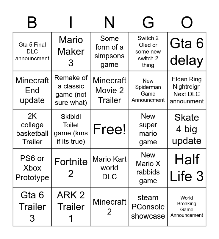 This bingo card has a free space and 25 words: Fortnite 2, Minecraft 2, Minecraft Movie 2 Trailer, Gta 6 Trailer 3, Gta 6 delay, Gta 5 Final DLC announcment, Minecraft End update, Mario Maker 3, New super mario game, Mario Kart world DLC, New Spiderman Game Announcment, 2K college basketball Trailer, New Mario X rabbids game, Half Life 3, Remake of a classic game (not sure what), Gta 6 Map reveal, Skate 4 big update, Some form of a simpsons game, Elden Ring Nightreign Next DLC announment, Skibidi Toilet game (kms if its true), World Breaking Game Announcement, ARK 2 Trailer 1, PS6 or Xbox Prototype, Switch 2 Oled or some new switch 2 thing and steam PConsole showcase.